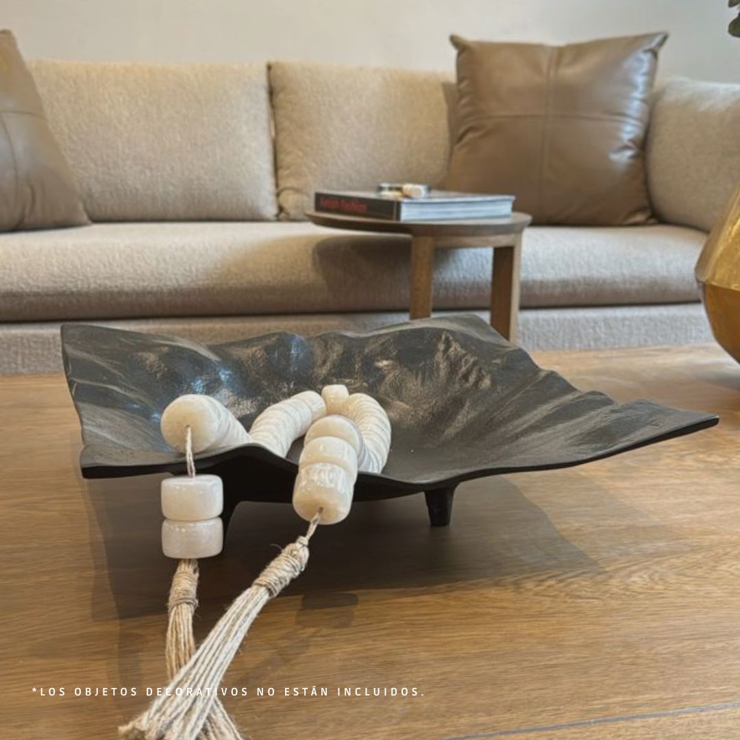 Bandeja de metal cuadrada en color plomo. Este tipo de bandeja puede ser muy versátil y elegante.