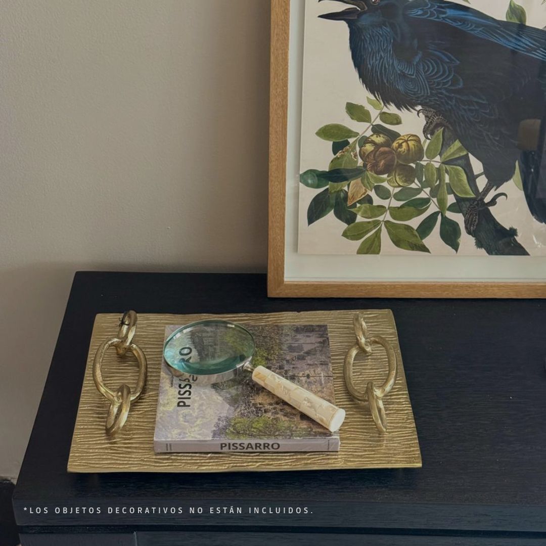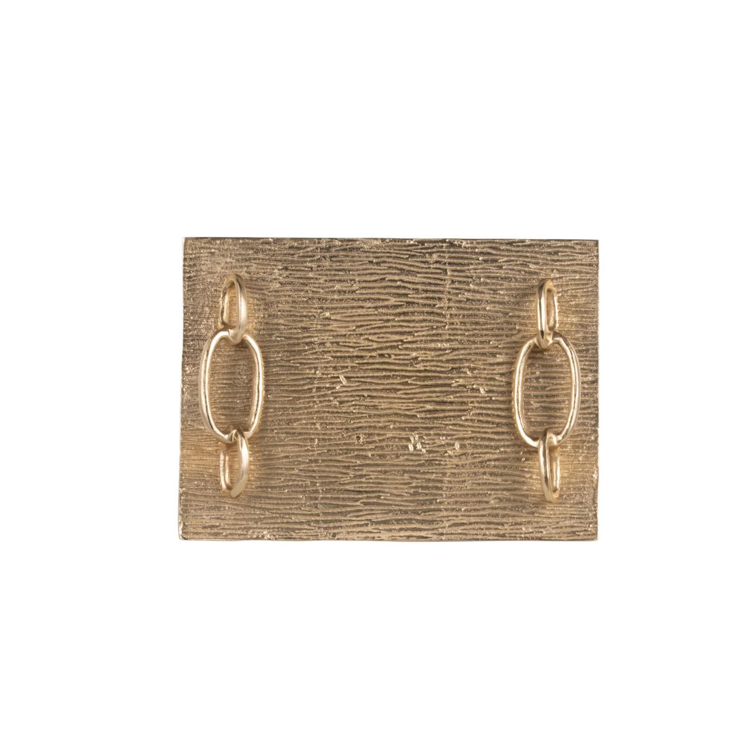 Bandeja de metal dorada con un diseño elegante y sofisticado. Su superficie presenta una textura acanalada, con líneas finas y paralelas que recorren toda la base, creando un efecto visual de profundidad y brillo cuando la luz incide sobre ella.